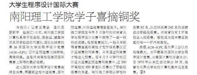 本报讯(记者王秀云 通讯员 罗新宇 赵东江)日前,南阳理工学院计算机系学子张云聪、侯志远、裴垒浩三名同学组成的代表队,在刚刚结束的第36届国际大学生程序设计竞赛(ACM-ICPC)亚洲区预选赛力挫群雄,勇摘铜奖。这是河南高校在该项国际赛事上取得的最好成绩。
