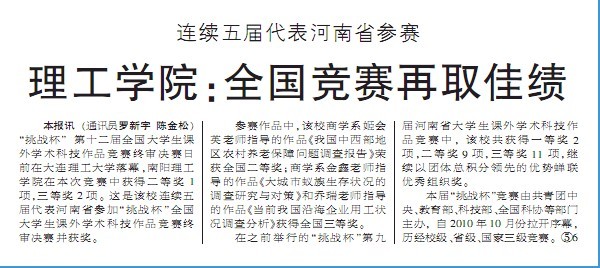在之前举行的“挑战杯”第九届河南省大学生课外学术科技作品竞赛中,该校共获得一等奖2项,二等奖9项,三等奖11项,继续以团体总积分领先的优势蝉联优秀组织奖。