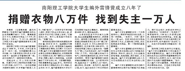 本报讯 (记者陈杰超 通讯员罗新宇)“目前我们编外雷锋营共向社会各界捐赠衣被8.1万件,募集捐款近8万元,收集丢失物品1.3万件,找到失主1万多人。”3月3日,南阳理工学院大学生编外雷锋营教导员王琦丹兴奋地说。