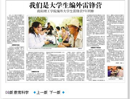 在南阳理工学院,编外大学生雷锋营与大学生暑期“三下乡”社会实践活动紧密结合,使学生们不仅通过活动体验生活、奉献社会、实践知识、展示才华,而且通过活动持续不断地传播雷锋精神,成为了该校加强和改进大学生思想政治工作的一项独特举措。