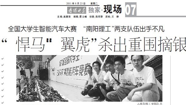 本报讯(记者张展 通讯员罗新宇 徐源)8月20日,第六届“飞思卡尔”杯全国大学生智能汽车竞赛全国总决赛在西安西北工业大学落下帷幕。首次进入总决赛的南阳理工学院的两支队伍“悍马”、“翼虎”荣获二等奖。