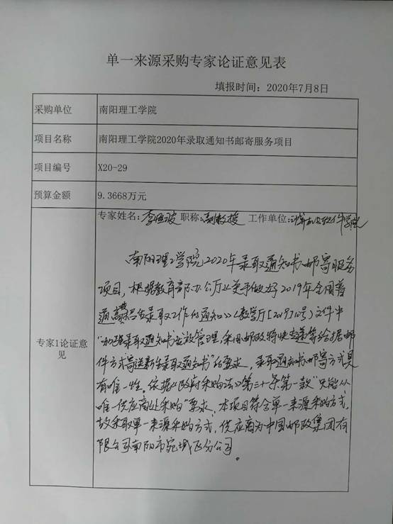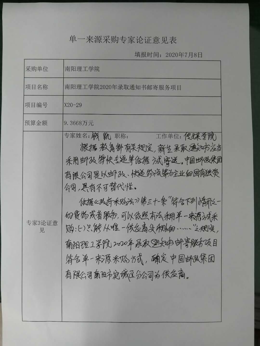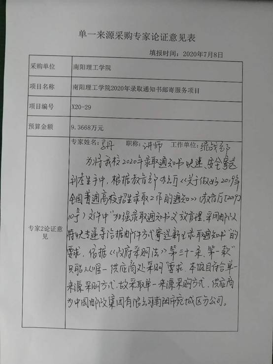 南阳理工学院2020年录取通知书邮寄服务项目拟采用单一来源采购的公示
