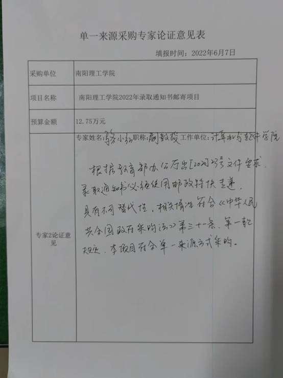 为做好我校录取通知书邮寄工作,将录取通知书快速、安全寄送到考生手中,根据教育部办公厅《教育部办公厅国家邮政局办公室关于进一步做好2020年高校录取通知书寄递工作的通知》(教学厅函〔2020〕23号)文件中“录取通知书必须使用邮寄特快专递等给据邮寄方式寄递”的要求,我校拟采用中国邮政特快专递方式寄送录取通知书。中国邮政速递物流股份有限公司南阳市分公司,以邮政、快递物流等为主业,具有不可替代性。