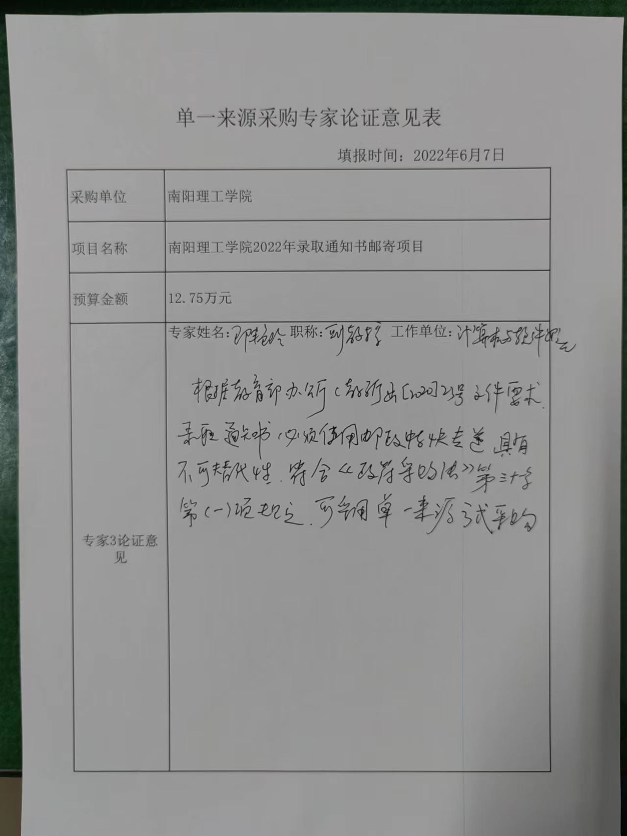 南阳理工学院2022年录取通知书邮寄服务项目拟采用单一来源采购的公示