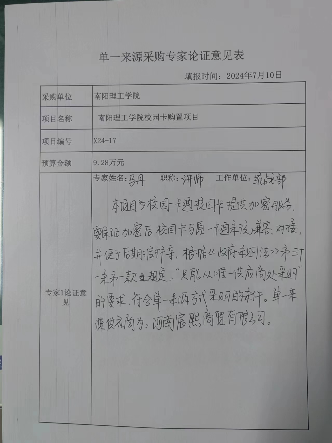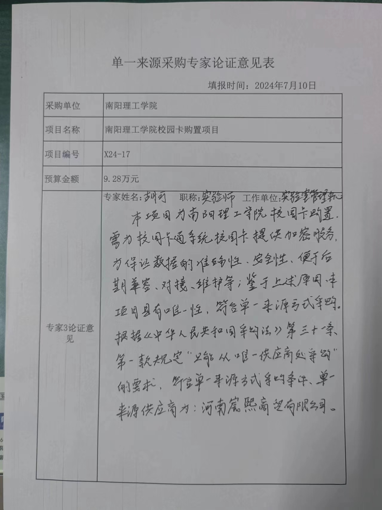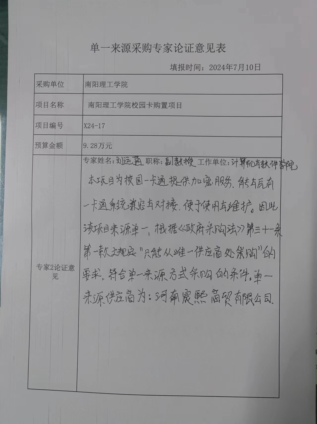 南阳理工学院校园卡购置项目拟采用单一来源采购的论证公示