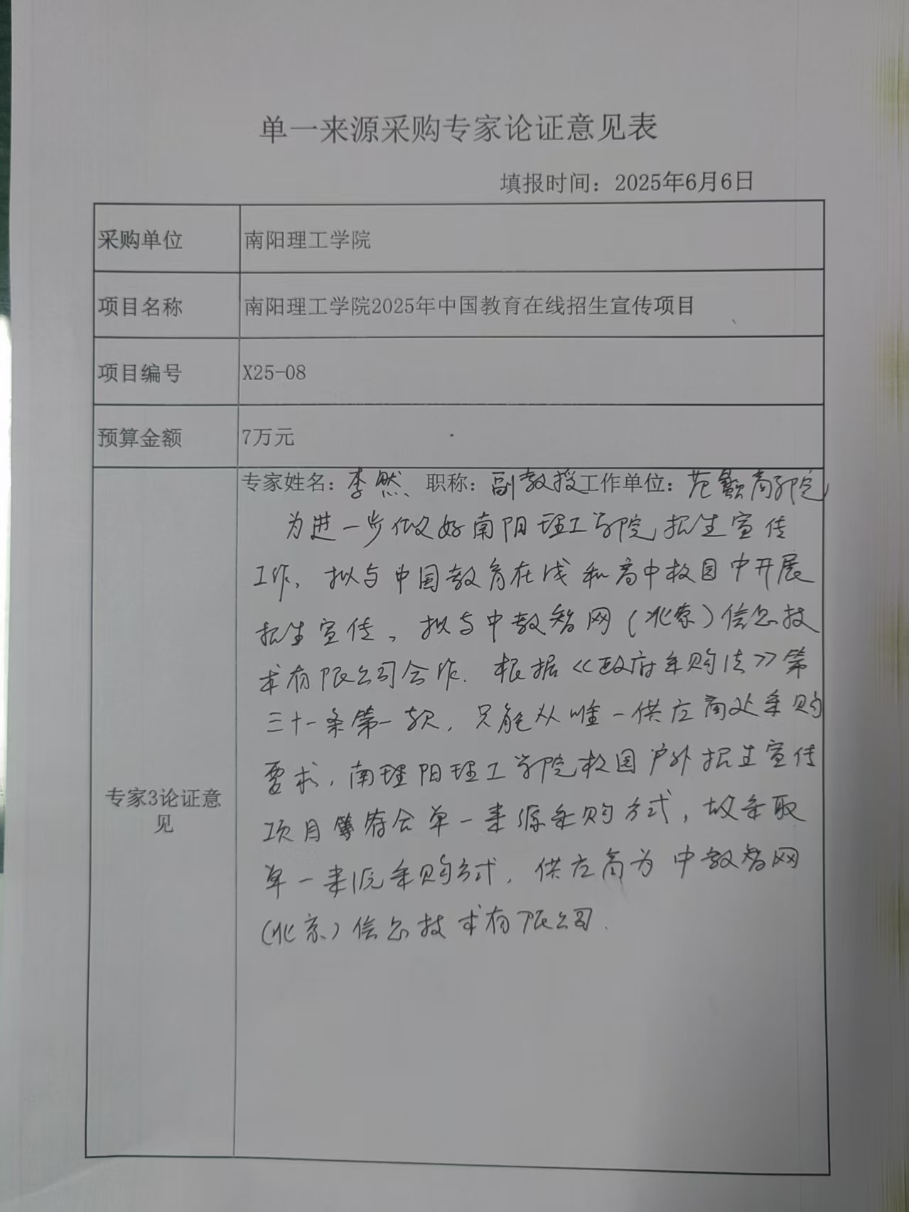 南阳理工学院2025年中国教育在线招生宣传项目拟采用单一来源采购的论证公示
